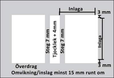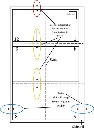 Omslag till limbundna och trådhäftade mjukbandsböcker bör täcka inlagan innan renskärning. Önskvärt, 6mm i huvudet på omslaget. 5mm i huvudet på inlagan.